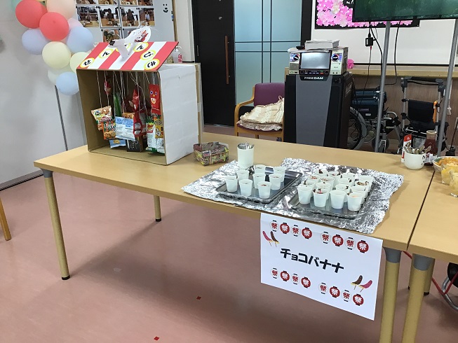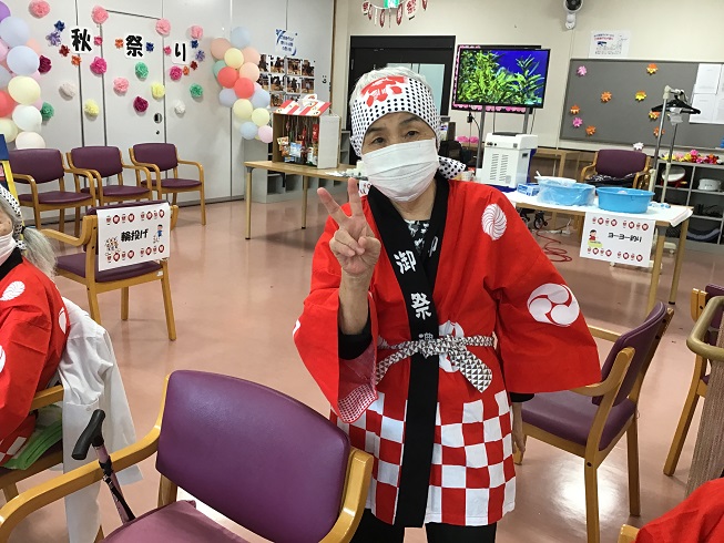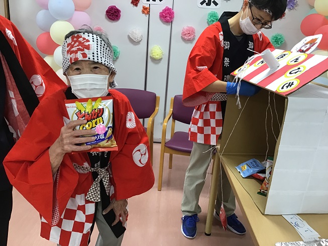 こんにちは! 9/23(土)にデイサービスにて秋祭りを開催しました٩( ''ω'' )و チョコバナナやかき氷、千本引きや水ヨーヨーすくいなどの縁日ブースを楽しんでいただきました♪ 「ハッピを着てお祭り気分が楽しめた!」と喜んでいただけました(^^♪