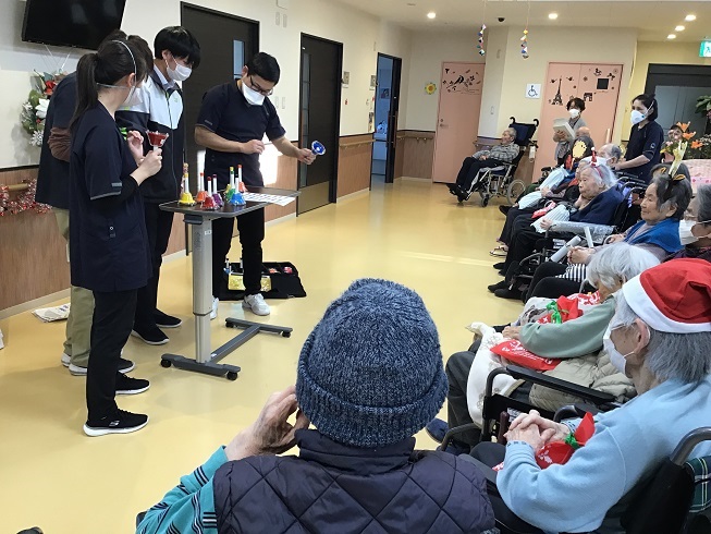 ハンドベル演奏やボーリング大会、職員と利用者様でクリスマスソングを歌ったりと
