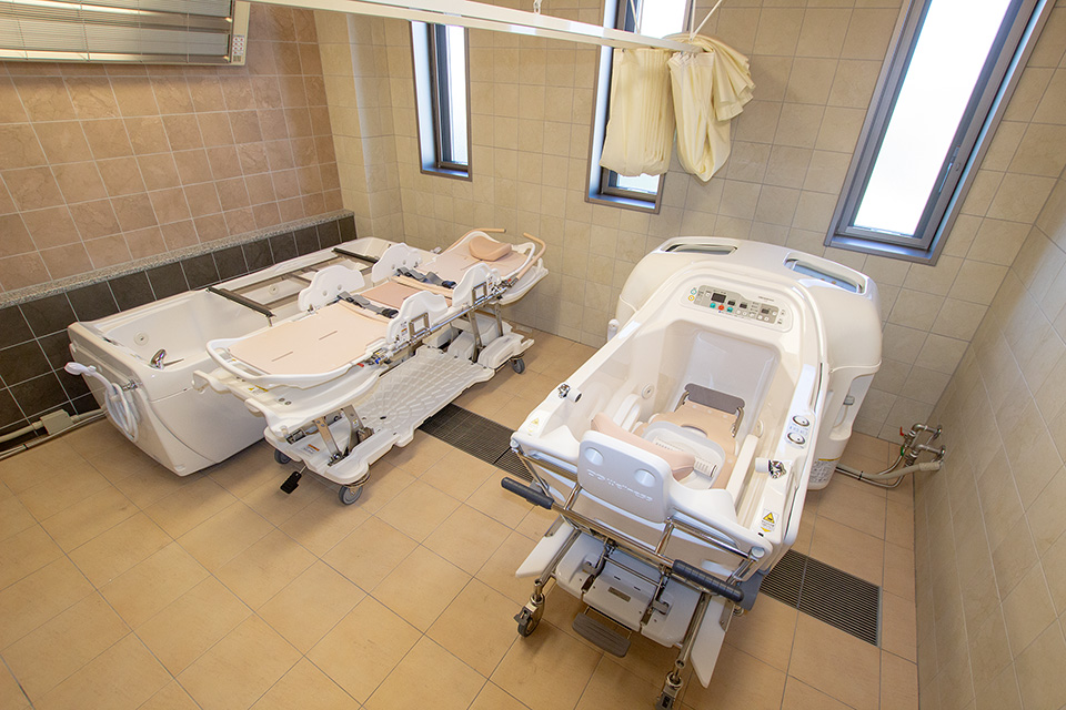 個浴や機械式浴槽を備え、利用者様の身体状況に応じた入浴が可能です。職員が丁寧にサポートし、安全で快適な入浴を心がけています。